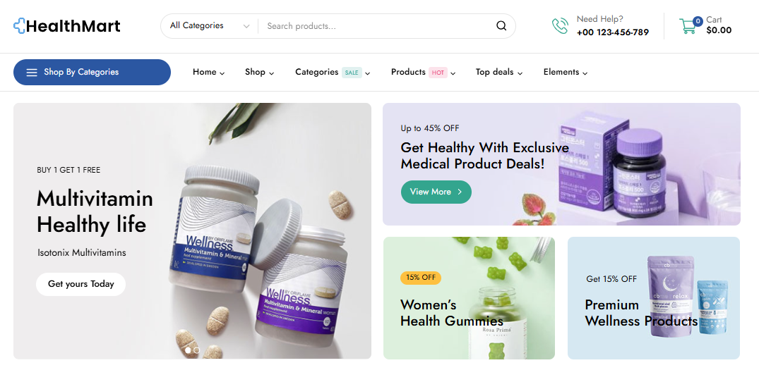 Create advanced menus to showcase more than just categories. Perfect for pharmacy websites with extensive product catalogs.